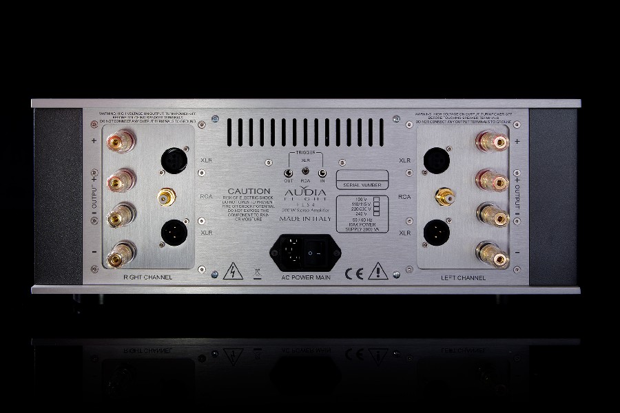 Audia Flight FLS 4 — литой, выполненный из алюминиевого сплава. Схемотехника — полностью балансная; используется по 16 отобранных транзисторов и блок питания с конденсаторами суммарной емкостью 288 000 мкФ.