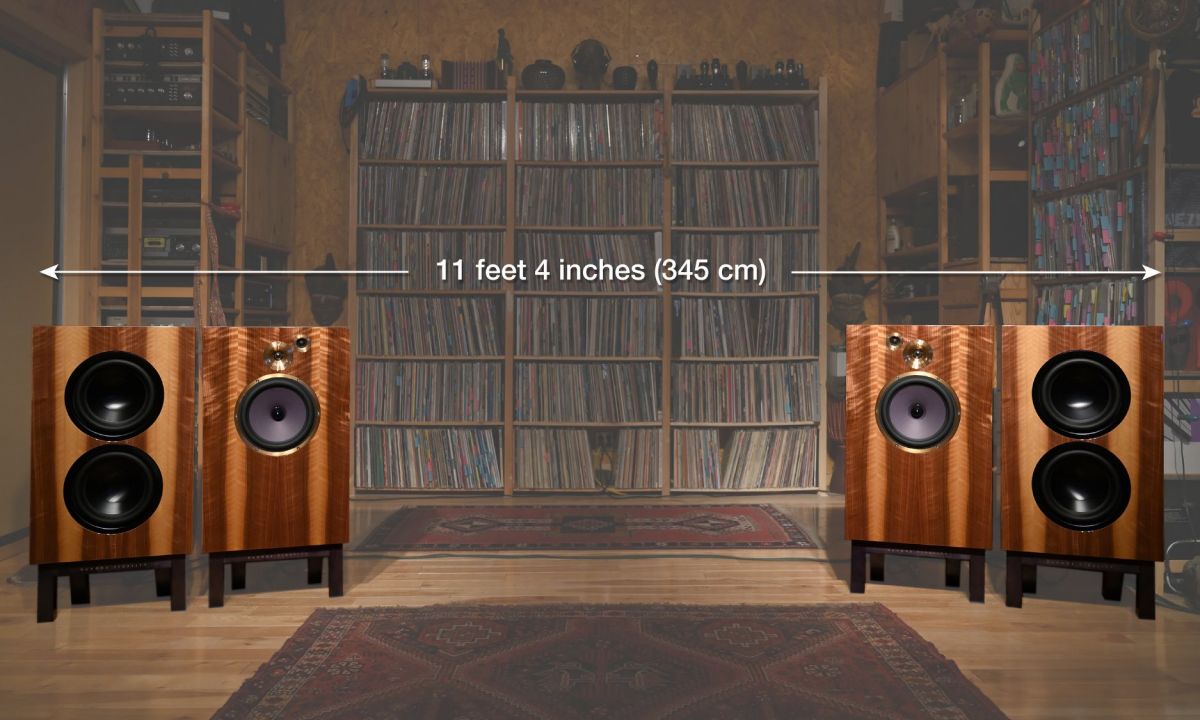 - большая комната - расстояние между АС должно быть равно 136' или 345 см;