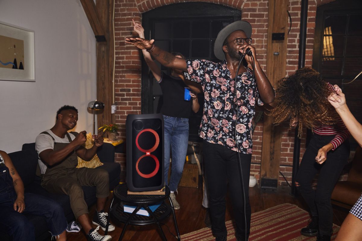 JBL PartyBox 100 подключается к источникам звука по Bluetooth, поддерживая одновременный контакт с двумя устройствами: звук будет воспроизводиться с последнего, подавшего сигнал. Помимо этого, на задней панели расположены порт USB для воспроизведения музыки в MP3 с флэш-накопителя и зарядки сторонних устройств, вход на мини-джеке 3,5 мм и два разъема TRS с регуляторами уровня громкости для подключения микрофона и музыкального инструмента. Заряда встроенного аккумулятора хватит на то, чтобы праздник продолжался всю ночь – 12 часов музыки нон-стоп гарантированы. Конструкция предусматривает специальное отверстие для размещения колонки на стойках-треногах и настенных кронштейнах.
