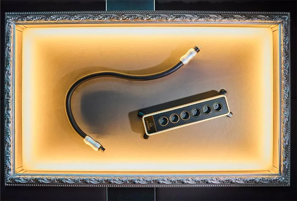 Внутренняя проводка, состоящая из множества жил с покрытием из чистого бескислородного серебра, были тщательно отобраны после нескольких часов испытаний, прослушивания и сравнения. Проводка заключена в массивный алюминиевый корпус с эффективной защитой от электромагнитных и (радиочастотных помех. Распределитель питания Kharma Exquisite Reference Powerblock оснащен входным разъёмом типа IEC C14 и шестью силовыми входами с европейскими силовыми розетками.
