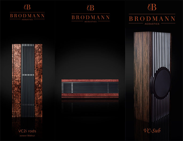 Также фирма Brodmann предлагает заказные индивидуальные отделки акустических систем. Возможно нанесение рисунка, вставка гнутой латунной ленты, комбинирование шпона и лака.