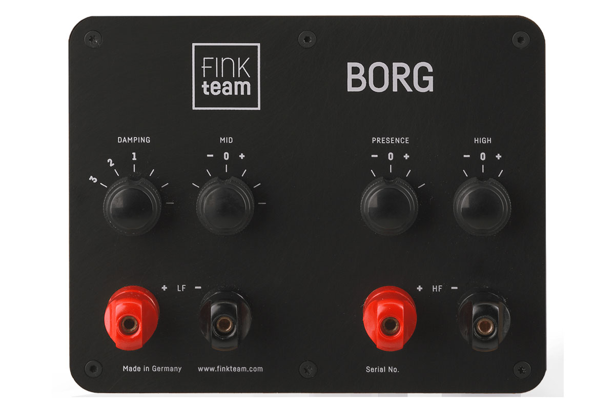 При разработке акустики Borg инженеры FinkTeam особое внимание уделили демпфированию лицевой панели, на которой смонтирован ленточный твитер АМТ, изготовленный компанией Mundorf по заказу FinkTeam, а также массивный басовый излучатель с диффузором диаметром 10,25 дюйма. Лицевая панель имеет многослойную структуру и сочетает в себе слои МДФ различной толщины, между которыми проложены слои демпфирующего материала. Толщина каждого слоя была рассчитана с использованием фирменных технологий FinkTeam с целью компенсации паразитных резонансов. Результату также способствует металлическое кольцо, используемое при креплении низкочастотного динамика.