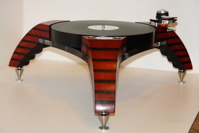 Главное шасси представляет собой сэндвич из слоев черного и прозрачного акрила, соединенных при помощи особого состава, гарантирующего жесткость и отсутствие резонансов. Опорный поворотный диск Arcadia мастера Jarett Acoustics изготавливают из 21 переработанной виниловой пластинки.