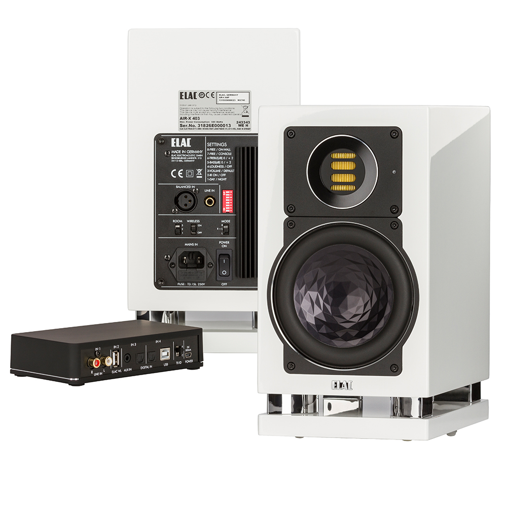 Air-X. Технология дебютировала на базе акустических систем 403 и 407. Инженеры Elac предложили уникальную комбинацию беспроводной связи колонок с центральным блоком и классического аналогового усиления. Используемый беспроводной интерфейс Air-X обеспечивает трансляцию музыкального сигнала с параметрами 24 бит / 48 кГц без компрессии и без потерь на частоте 2,4 ГГц на расстояние до 70 метров. Суммарная мощность усилителя Air-X AMP составляет 225 Ватт при работе с нагрузкой 4 Ом. Кроме беспроводного подключения возможно использование и обычной коммутации, для чего акустические системы оснащены балансным и небалансным входами. Базовый блок системы Air-X кроме двух аналоговых и двух цифровых оптических входов оснащен портом USB type B для работы с компьютером в качестве внешней звуковой карты. Он способен транслировать по воздуху до четырех потоков одновременно в три отдельные зоны. При этом, возможно использовать в одной связке до трех таких блоков, что дает практически неограниченные возможности по конфигурации системы.