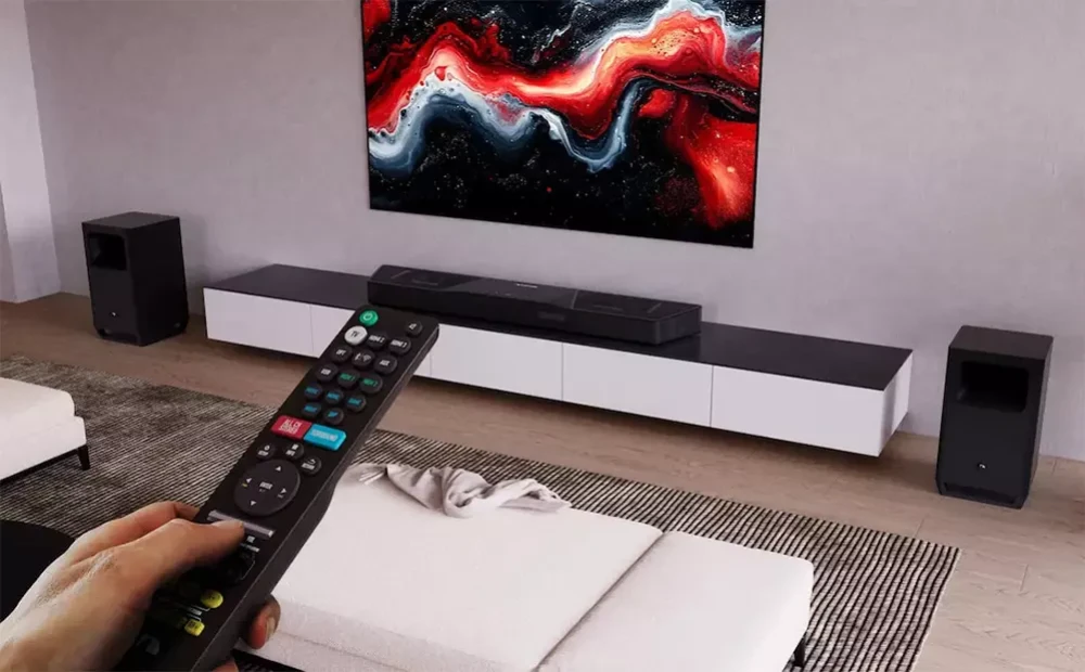 Саундбар: 54-дюймовый корпус с футуристическим дизайном и отдельными камерами для динамиков различных каналов системы.