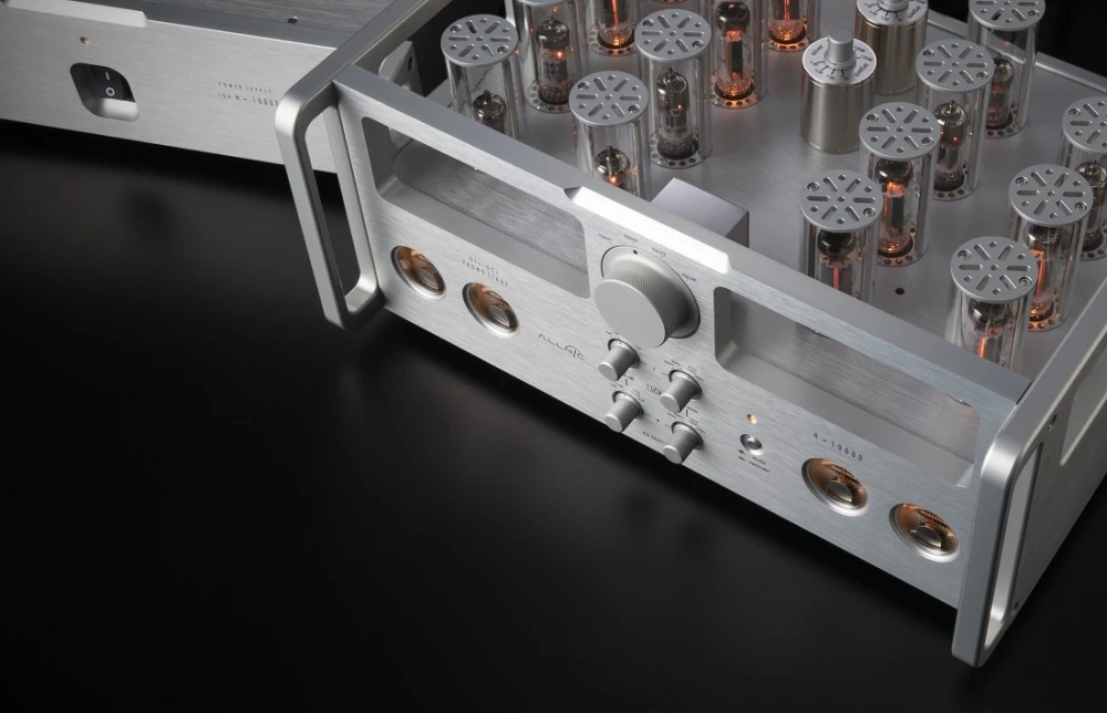 Как и в других наших конструкциях OTL/OCL, выходные трансформаторы с пермаллоевым сердечником, которые являются спрайдами Allnic, исчезли из H-10000. Вместо этого две выходные лампы 7233 на канал образуют несимметричную двухтактную схему (SEPP), которая использует как положительную, так и отрицательную мощность, чтобы предотвратить переход постоянного тока на следующий каскад. Причина, по которой 7233 была выбрана в качестве выходной лампы, заключается в том, что она имеет очень низкое внутреннее сопротивление; при сопротивлении всего 230 Ом он может мощно управлять следующим предусилителем или интегрированным усилителем без окраски или искажений.