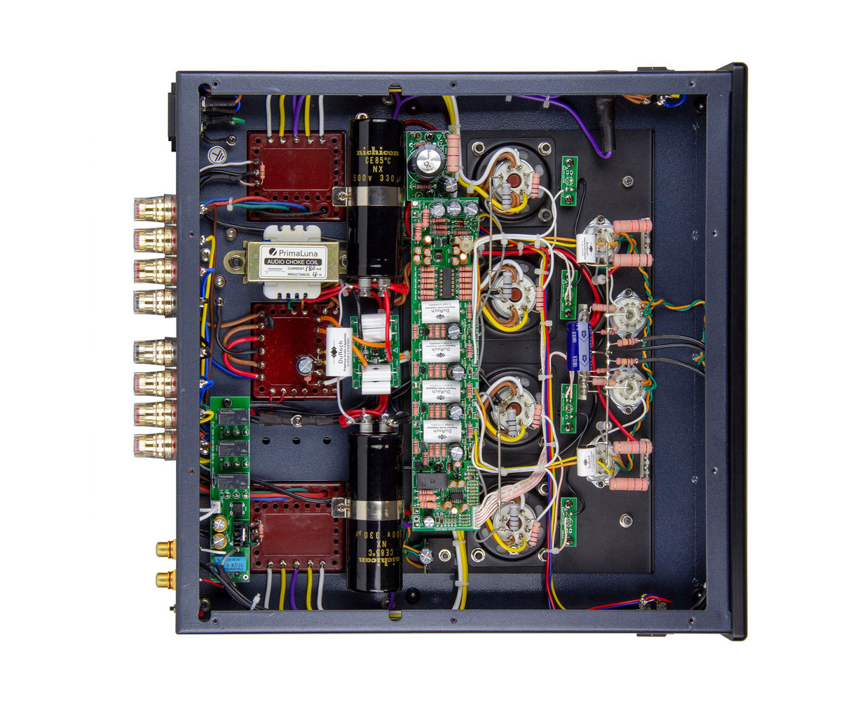 Во всех своих продуктах PrimaLuna использует навесной монтаж с пайкой проводов от точки-к-точке (Point to Point Wiring) и тщательно продуманное расположение компонентов. Весь путь сигнала, включая резисторы и конденсаторы, кропотливо пропаян вручную толстым кабелем мастерами своего дела.