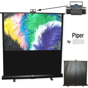 , отличающаяся компактными габаритами и оригинальным дизайном. Корпус здесь построен по принципу трансформера. На нижней части закреплены складные ножки. Вертикальная телескопическая мачта в сложенном состоянии также плотно зафиксирована на кожухе. Отсутствие съемных деталей является существенным достоинством: ни один из элементов конструкции не будет потерян при перевозке. Кожух экрана выполнен из прочного экструдированного алюминия, покрытого износостойкой порошковой краской. Для удобства эксплуатации дополнительно можно приобрести фирменный чехол, сшитый из матового материала темного цвета. Приведение экрана в рабочее состояние требует минимума действий: нужно лишь развернуть опоры перпендикулярно кожуху, поднять телескопическую штангу на желаемую высоту и, наконец, выдвинуть полотно, закрепив его на верхней части штанги. Никаких отверток, винтов и зажимов не требуется. Положение полотна четко фиксируется, так что экран получается ровным и аккуратно натянутым. Высота уже собранного Draper Piper при необходимости легко регулируется. Полотно новинки заметно отличается от аналогов. Первое, что бросается в глаза – черное обрамление по краям экрана. Причем под белой видимой областью (на которую проецируется изображение) обрамление продолжается вплоть до самого пола. Подобное решение придает Draper Piper необычный и привлекательный внешний вид. Несмотря на невысокую стоимость изделия, для изготовления полотна использован высококачественный материал Matt White, отличающийся высокой прочностью и устойчивостью к механическим повреждениям. Компания Draper выпускает экраны Piper различных размеров и с разным соотношением длин сторон. Доступен как стандартный формат NTSC диагональю от 60 до 84 дюймов, так и широкоэкранный вариант HDTV от 55 до 77 дюймов. Draper Piper является практичным мобильным решением, которое подходит для широкого круга бизнес-пользователей.