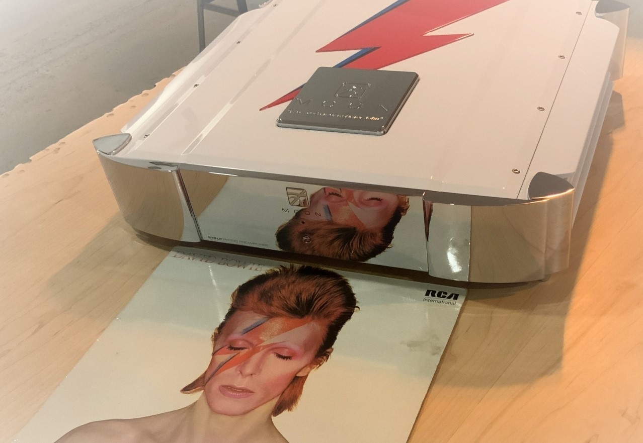 Корпус модели получил специальное белое покрытие, а на верхней панели нанесена эмалью знаменитая красная молния, украшавшая лицо Дэвида Боуи (David Bowie) на обложке альбома «Aladdin Sane». Там же расположена медная табличка с названием бренда и цитатой из хита Space Oddity – «Ground Control to Major Tom». Сам фонокорректор Simaudio MOON 810LP отличается точнейшим соответствием кривой RIAA и наличием внутренней системы подвеса, эффективно борющейся с микрофонным эффектом.
