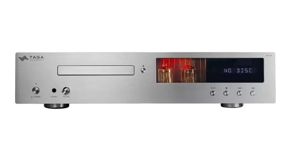Польский бренд Taga Harmony известен бюджетными моделями аудиотехники, которые обеспечивают высокое качество звучания по доступным ценам. Один из них – проигрыватель компакт-дисков Taga Harmony TCD-70T, выходной каскад которого реализован на двух лампах 6N2, установленных на керамических колодках. Цифро-аналоговое преобразование реализовано здесь на чипе Sabre ES9018 от компании ESS Technology, а в линейном блоке питания используется тороидальный силовой трансформатор трансформатор мощностью 100 Вт.