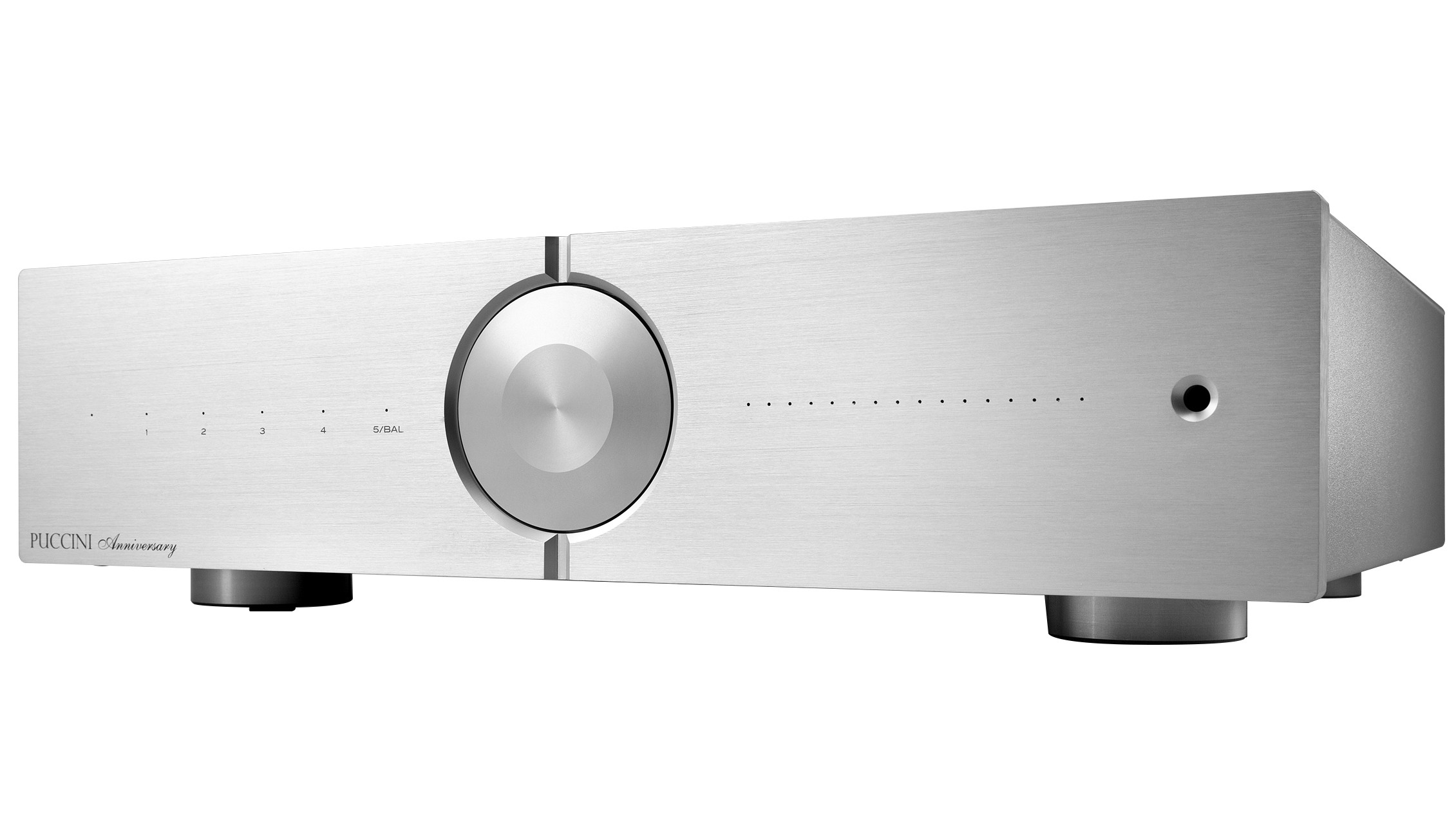 Puccini Anniversary на основе схемы полное двойное моно без отрицательной обратной связи содержит источник питания нс трансформатором мощностью 700 ВА, по три пары мощных транзисторов в выходных каскадах каналов и обеспечивает выходную мощность 80 Вт на 8 Ом (300 Вт на 2 Ом).