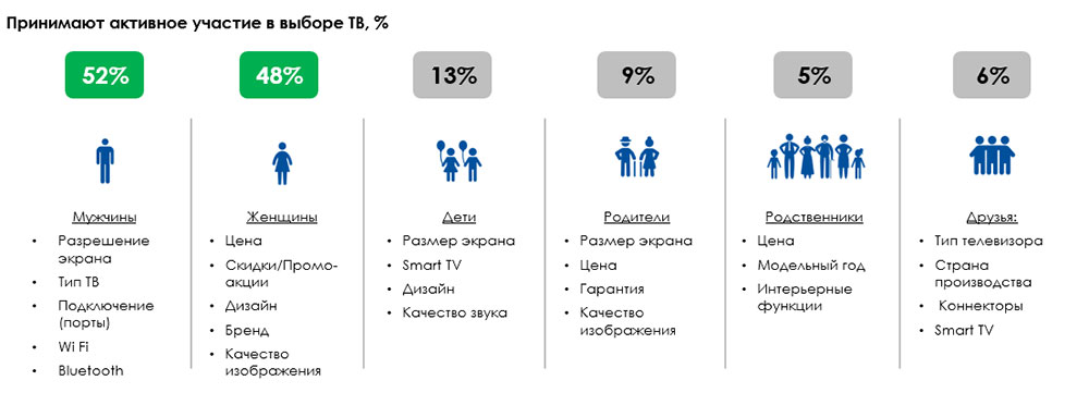 Подходы мужчин и женщин при выборе ТВ несколько отличаются. Согласно опросу Samsung, женщины чаще обращают внимание на стоимость, наличие скидок, в то время как для мужчин важнее разрешение экрана и наличие «умных» функций. Иногда участие в выборе телевизора принимают дети и родители покупателей. Общим для всех интересом является размер экрана. Дети больше значения придают развлекательным функциям, в то время как для старшего поколения важнее качество и гарантийные условия.