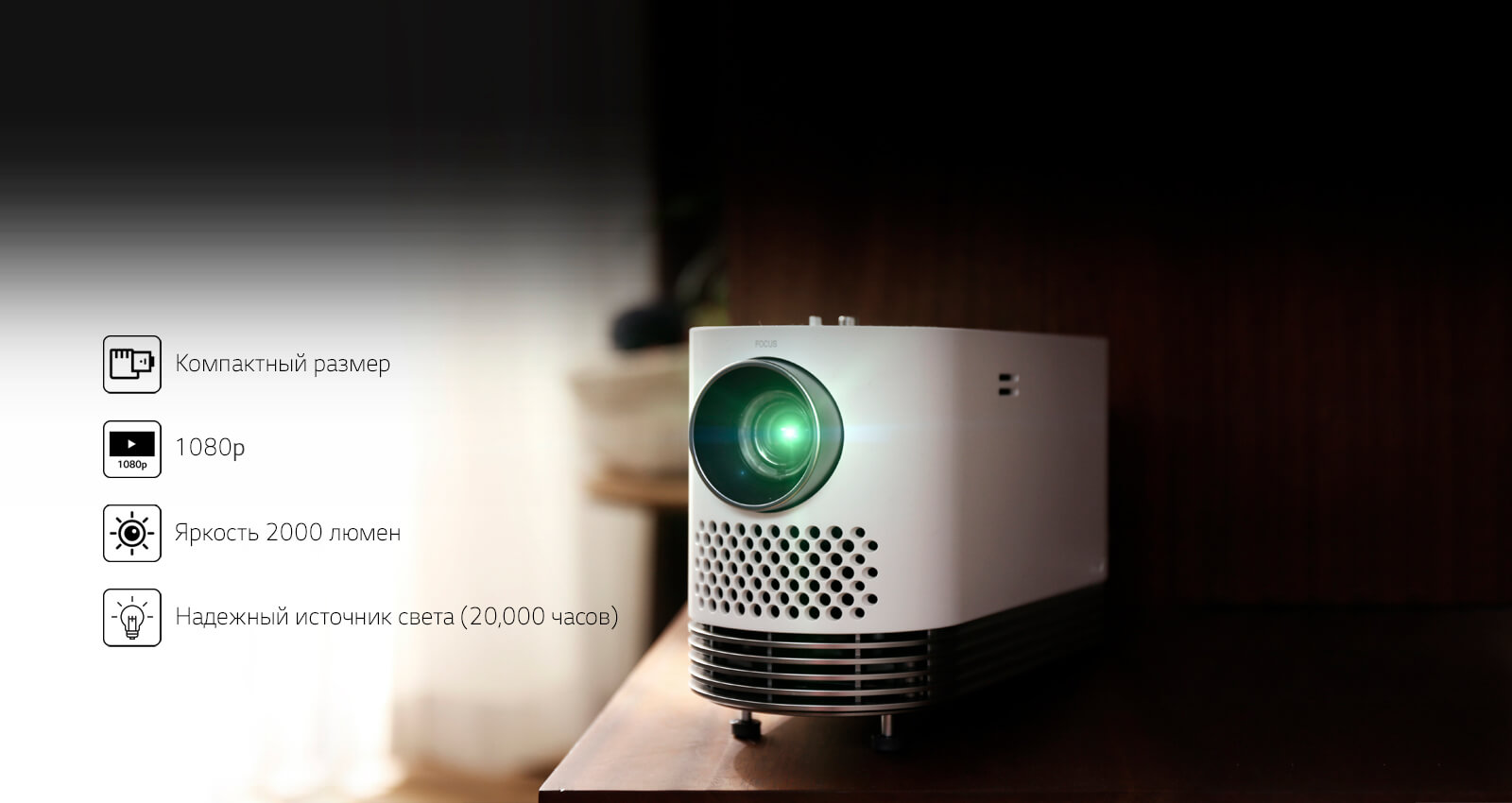 Ультракороткий фокус проектора LG HF85LSR с яркостью 1500 Люмен обеспечивает изображение диагональю 90" при установке проектора всего в 8 см от стены. Проектор можно просто поставить на стол или тумбу, и он гармонично впишется в дизайн вашего интерьера. Вы можете не беспокоиться из-за теней на экране, так как ультракороткий фокус исключает возможность их появления. Проектор оптимален для домашнего использования. Вы сможете насладиться качественным изображением даже в условиях стандартной гостиной.