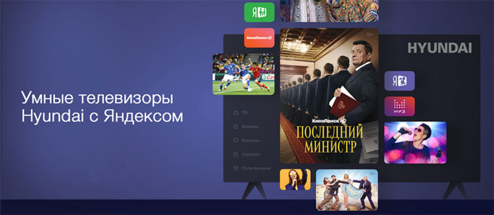 В ассортименте компании Hyundai появилась линейка Smart TV с мультимедиа-платформой Яндекс. Hyundai в числе первых брендов выпустил телевизоры с новой платформой на российский рынок. 24 апреля Яндекс объявил о запуске мультимедиа-платформы для умных телевизоров. Новинка работает на базе ОС Android, благодаря ей пользователи могут смотреть телеканалы, фильмы, сериалы и ролики из Интернета в одном интерфейсе. Помимо эфирных каналов платформа объединяет более 200 бесплатных каналов «Яндекс.Эфира» и онлайн-кинотеатр «КиноПоиск HD», поддерживает голосовой поиск и включает рекомендательную систему. Кроме того, на новых телевизорах Hyundai с платформой Яндекс также можно смотреть ролики на YouTube, фильмы и сериалы в нескольких популярных онлайн-кинотеатрах. Чтобы ограничить детей от просмотра нежелательного контента, предусмотрена функция «родительский контроль».